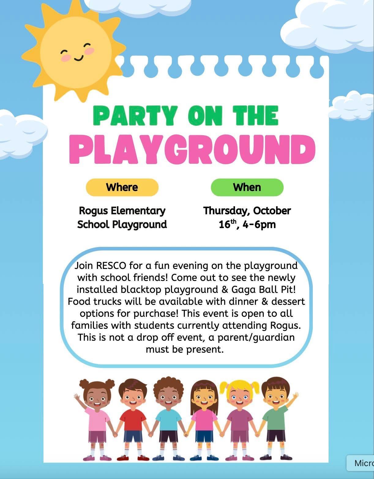 Join RESCO for a fun evening on the DJR playground! Food trucks will be available with dinner and dessert options for purchase. Event is for DJR students and their families only. Not a drop-off event - a parent/guardian must be present.